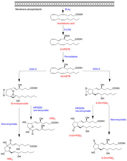 Besides a role in the biosynthesis of LTs and LXs, 5-LOX is also a key enzyme in the biosynthesis of a novel type of eicosanoids recently described. In vitro biochemical studies showed that COX-2 catalyzes the oxidation of the 5-LOX product 5S-HETE (resulting from the reduction of 5S-HPETE) to form a di-endoperoxide [43] and 5-OH-PGH2 [44], which are equivalent to the prostaglandin endoperoxide PGH2 of the COX-2 pathway. The reaction also yields two minor compounds identified as 5,11- and 5,15-di-HETE, the 5-hydroxy-analogs of the known COX by-products, 11- and 15-HETE [45,46]. Additional studies of the 5-LOX/COX-2 crossover pathways described the in vitro transformation (enzymatic and non-enzymatic) of the di-endoperoxide to two hemiketals (HKs) named HKE2 and HKD2 [13] and of 5-OH-PGH2 to 5-OH-PGE2 and 5-OH-PGD2 [44] as shown in Figure 3.