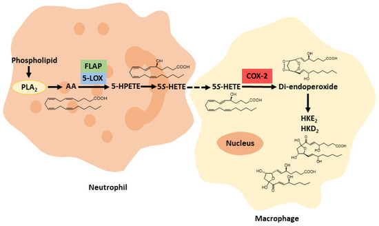 Biosynthesis of HKE2 and HKD2 was established using an ex vivo model of human isolated leukocytes, stimulated with calcium ionophore A23187 and LPS for 5-LOX activation and COX-2 up-regulation, respectively [13]. Analysis of the time-course of the formation of HKs in human leukocyte mixtures revealed that their biosynthesis mainly depends on the availability of the 5S-HETE substrate and, to a lesser extent, on the activity of COX-2 [47]. HK formation in the mixture of human leukocytes may be another example of transcellular biosynthesis, given that a single type of leukocyte is unlikely to exhibit a significant activity of both 5-LOX and COX-2. The dependence of HK biosynthesis on the activation of leukocyte mixtures by both A23187 (inducing 5-LOX) and LPS (inducing COX-2) suggests a role for neutrophils and activated monocytes/macrophages, respectively, although this was not directly established (Figure 4).