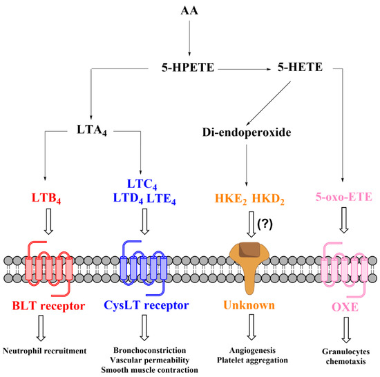 5-HETE is a particular eicosanoid that shows limited biological activity by itself but serves as a precursor to form biologically active molecules, including 5-oxo-ETE, HKs, and 5-OH-PGs. 5-oxo-ETE is an oxidized metabolite of 5S-HETE that binds to the 5-oxo-ETE receptor (OXE), exerting a powerful granulocyte chemoattractant effect [60,61,62].