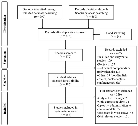 This review was conducted and reported following the Preferred Reporting Items for Systematic Review and Meta-Analyses (PRISMA) [92]. A comprehensive literature search was performed using PubMed and Scopus databases. The search strategy included the combination of the following search terms in abstracts and titles and was adapted for each database: (5-lipoxygenase or 5-LOX) and (phenol* or flavonoid* or polyphenol* or curcumin or resveratrol or EGCG or urolithin or procyanidin or proanthocyanidin or flavan* or flavone* or catechin or epicatechin or quercetin or curcumin or valerolactone or punicalagin or ellagic or tannin or lignan or isoflavone or equol or silymarin or thistle). Independent literature searches and article selection were completed from January to April 2021 by the authors. The authors also hand-searched the bibliography of identified articles.