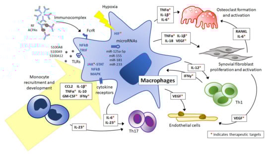 Therapeutic targets related to monocyte and macrophage activation in juvenile idiopathic arthritis. Monocytes (Mos) were recruited to the joints by CCL2 and differentiated into tissue macrophages (Mφs) under inflammatory conditions. IL-1β, TNFα, IFNγ, GM-CSF, and IL-10 are especially important for the differentiation process. Upon stimulation with cytokines, immunocomplexes, TLR ligands, the hypoxic microenvironment, and microRNAs, the mixed polarization of Mφs toward an inflammatory phenotype was mediated via the JAK-STAT, MAPK, NFκB, TRIF, and HIF signaling pathways. Proinflammatory cytokines, including IL-1β, IL-6, IL-12, IL-18, IL-23, and TNFα were secreted to stimulate activation of osteoclasts and synovial fibroblasts and to promote T lymphocyte polarization. VEGF drives synovial angiogenesis, contributing to JIA pathogenesis. Available therapeutic targets are marked with red asterisks *. Abbreviations: RF, rheumatoid factor; ACPAs, anti-citrullinated protein antibodies; CCL2, monocyte chemoattractant protein 1; TLRs, Toll-like receptors; FcγR, Fc gamma receptor; JAK, Janus kinase; STAT, signal transducer and activator of transcription; MAPKs, mitogen-activated protein kinases; TRIF, TIR-domain-containing adapter-inducing interferon; NFkB, nuclear factor kappa-light-chain-enhancer of activated B cells; HIF, hypoxia-inducible factor; Th1, type 1 T helper cells; Th17, type 17 T helper cells; RANKL, receptor activator of nuclear factor kappa beta ligand.