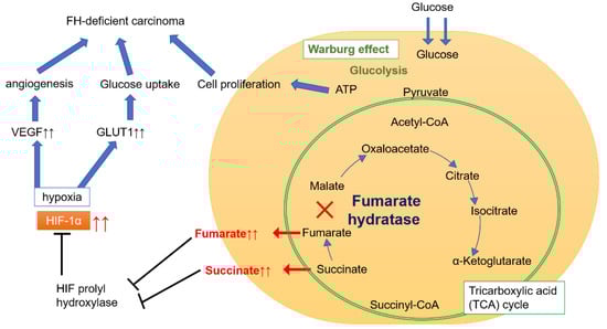The FH gene controls energy metabolism, and FH is involved in the tricarboxylic acid (TCA) cycle in mitochondria (Figure 1). The enzymatic function of FH is required for the conversion of fumarate. When FH malfunctions, the enzymatic activity of FH decreases, causing fumarate to accumulate. This, in turn, leads to succinate accumulation, stabilizing the hypoxia-inducible factor 1-alpha subunit, and causing the upregulation of vascular endothelial growth factor (VEGF) and glucose transporter 1 (GLUT1), thereby contributing to the carcinogenesis of high-grade RCC [].