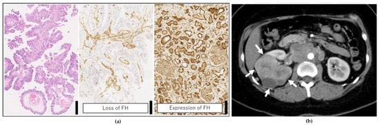 - Furuya, M.; Iribe, Y.; Nagashima, Y.; Kambe, N.; Ohe, C.; Kinoshita, H.; Sato, C.; Kishida, T.; Okubo, Y.; Numakura, K.; et al. Clinicopathological and molecular features of hereditary leiomyomatosis and renal cell cancer-associated renal cell carcinomas. J. Clin. Pathol. 2020, 73, 819–825. [Google Scholar] [CrossRef] [PubMed]