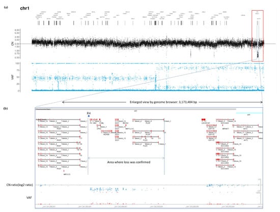 When re-examining the deleted region in the tumor-normal paired exome analysis results in detail, the loss in CNV was detected to be limited to the FH gene’s vicinity. However, the variant allele frequency (VAF) plot showed that the loss of heterozygosity (LOH) or acquired uniparental disomy (UPD) might have occurred in the entire 1q chromosome in the tumor. In other words, the VAF was split more widely in chromosome 1q, suggesting that a LOH or acquired UPD had occurred in the tumor. Among the regions where the VAF plot split, three suspected deletions were found in the CNV (at q23.3, q31.3, and q43, including the FH gene) (Figure S2).