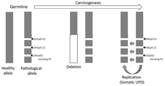 These data led to the postulate that there were originally three LOH regions in the germline FH-deficient allele. In the process of carcinogenesis, a large deletion occurred in the healthy allele, and by copying the FH-deficient allele, 3 LOH regions appeared in both alleles in the cancerous tissue cells, resulting in acquired somatic UPD (Figure 5).