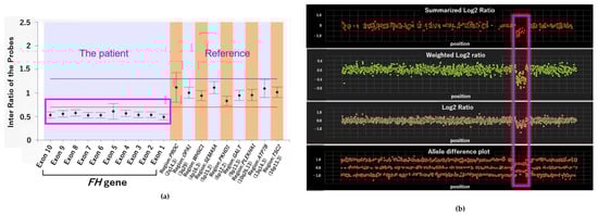 Analysis results of germline FH gene via multiplex ligation-dependent probe amplification (MLPA) and exon array. (a) Deletion of FH was confirmed by MLPA. (b) Result of exon array of chromosome 1.