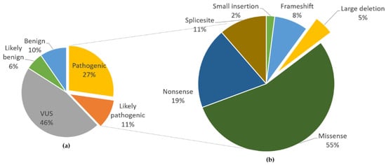 Summary of the relative frequency of FH variants. (a) Frequency of pathogenicity of 396 variants registered in the Leiden Open Variation Database (LOVD) []. Pathogenic variants comprised 27% and likely pathogenic variants 11% of all variants. (b) Types of pathogenic and likely pathogenic variants. Small deletions include all except whole-exon deletions, while large deletions include whole-exon to whole-gene deletions. VUS, variants of uncertain significance.