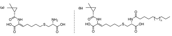 Cilastatin (Figure 1a) is an inhibitor of dehydropeptidase DHP-I, an enzyme that is present in the kidney. Originally, this drug was developed to be administered in combination with the antibiotic imipenem as it can inhibit the metabolism and the tubular injury produced by imipenem [40]. Recent studies have also shown that cilastatin is able to reduce the renal impairment caused by several drugs used in cancer chemotherapy, such as cisplatin, vancomycin, and colistin, both in vitro and in vivo [41]. Cilastatin acts as a protector of the proximal tubular epithelial cells (PTECs) that suffer from apoptosis induced by the nephrotoxic drugs. Importantly, cilastatin does not affect the antibiotic or anticancer activity of the other drugs, but it reduces their inherent toxicity so that a higher dose of the medication can be administered without risk of nephrotoxicity [42,43]. Since in many patients with cancer the dosage of the drug must be diminished due to its renal toxicity, cilastatin would enhance the prognosis of cancer patients [44].