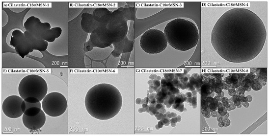 TEM images of the materials synthesized according to the reaction conditions in Table 1. (A) Cilastatin-C18@MSN-1; (B) Cilastatin-C18@MSN-2; (C) Cilastatin-C18@MSN-3; (D) Cilastatin-C18@MSN-4; (E) Cilastatin-C10@MSN-5; (F) Cilastatin-C10@MSN-6; (G) Cilastatin-C10@MSN-7; (H) Cilastatin-C10@MSN-8.