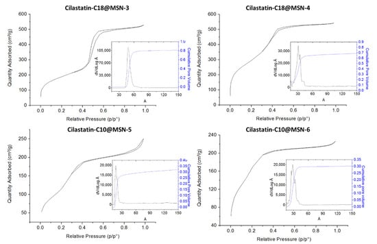 N2 adsorption–desorption isotherms and pore size distributions (PSD) based on a NLDFT model of Cilastatin-C18@MSN-3, Cilastatin-C18@MSN-4, Cilastatin-C18@MSN-5, and Cilastatin-C18@MSN-6.