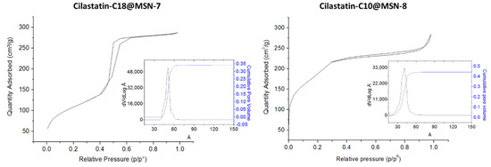N2 adsorption–desorption isotherms and pore size distributions (PSD) based on a NLDFT model of Cilastatin-C18@MSN-7 and Cilastatin-C10@MSN-8.