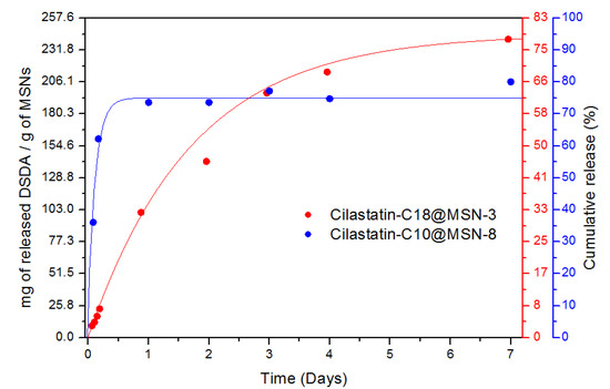 The amount of DSDA released per gram of MSNs was plotted against time to construct the release profile for each DSDA (Figure 5). Both materials showed a slow and sustained release of the drug during several days. Cilastatin-C18@MSN-3 released 100 mg of cilastatin-C18 in 1 day and 200 mg in 4 days. These amounts correspond to percentages of around 32% of the maximum theoretical release after 1 day and 68% after 4 days. Cilastatin-C18@MSN-3 reaches a maximum release of around 78% after 7 days which is equivalent to around 240 mg of cilastatin-C18 per gram of MSN (Figure 5 in red). This material shows a slow and sustained release of the drug over a long period of time, which makes it an adequate system to be employed in drug delivery.