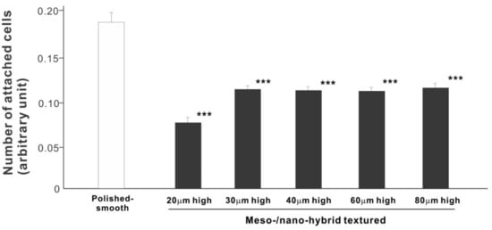 - Hori, N.; Iwasa, F.; Ueno, T.; Takeuchi, K.; Tsukimura, N.; Yamada, M.; Hattori, M.; Yamamoto, A.; Ogawa, T. Selective cell affinity of biomimetic micro-nano-hybrid structured TiO2 overcomes the biological dilemma of osteoblasts. Dent. Mater. 2010, 26, 275–287. [Google Scholar] [CrossRef]