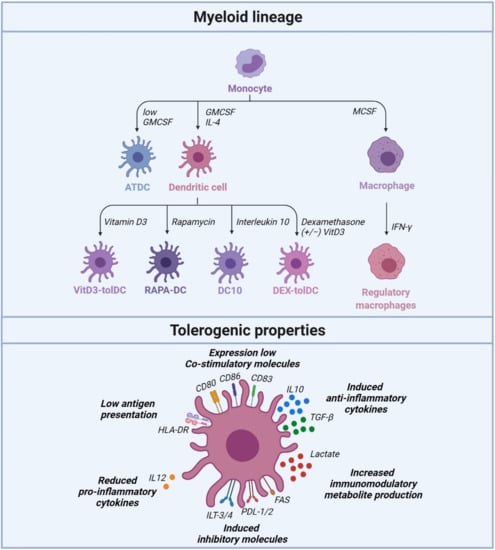 Moreover, the number of tolDC subsets being described continues to increase and the optimal subset to be used as a medicinal product must be defined for each application in different pathologies and micro-environments. A comparative analysis of diverse populations of in vitro-differentiated tolDCs examining their stability, cytokine production profile, and suppressive activity indicated that all different subsets of myeloid regulatory cells have beneficial properties in maintaining a tolerogenic environment []. TolDC-based therapy can restore the immune system to a more homeostatic level, thereby decreasing the adverse side-effects of conventional immunosuppressive drugs []. The next goal will be to better understand the properties and application of tolDCs concerning immunological diseases. New methods of single-cell analysis can interpret the precise communication between immune cells []. Recent studies have also shown that immune metabolism and the micro-environment plays a pivotal role in controlling the functionality and properties of tolDCs. Epigenetic alterations for future therapies may provide novel targets to modulate the state of tolDCs []. Therefore, immune cell therapy in immunological diseases demands further investigation in the application of myeloid regulatory cells and their effect in vivo via larger clinical trials [].