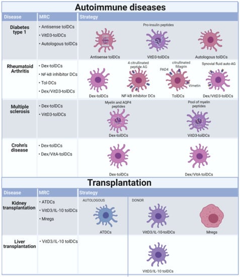 Knowledge of tolerogenic DCs (tolDCs) and regulatory macrophages (Mreg) has also been expanding over recent years, and has shown promising results in animal models. This has extended to several phase I clinical trials to assess tolDCs in the treatment of autoimmune diseases and the prevention of transplantation rejection [,,,,,,,]. Cell-based therapies are an attractive alternative to general immunosuppressive treatments due to the possibility of inducing antigen-specific immunological tolerance and the long-lived effect of self-reinforcing peripheral regulation.