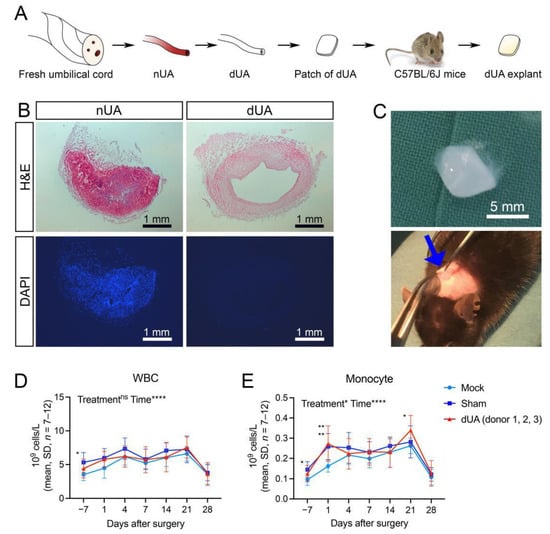 Implantation of decellularised umbilical artery (dUA) in mice. (A) Flow chart for the study design for subcutaneous implantation of a human dUA patch into mice. Human native umbilical artery (nUA) was dissected from fresh umbilical cord and decellularised by a 3-day protocol. The dUA was cut into small patches and subcutaneously implanted in mice and explanted after 28 days. (B) Haematoxylin and eosin (H&E) and DAPI staining of nUA and dUA, showing efficient decellularisation. (C) Representative images of a 5 × 5 mm dUA patch inserted in a subcutaneous dorsal pocket (marked by blue arrow) on a C57BL/6J mouse. (D,E) White blood cell (WBC) and monocyte count in peripheral blood was monitored 7 days before and at 1, 4, 7, 14, 21, and 28 days after implantation. The effect of treatment (mock, sham and dUA) and time after surgery were analysed by mixed-effects analysis (post-test: Tukey test) for statistics (mock: n = 7; sham: n = 8; dUA: n = 3 (n* = 4)). See also Supplementary Figure S1 for replicate dUA donor measurements. * p ≤ 0.05, ** p ≤ 0.01, **** p ≤ 0.0001, ns p > 0.05.