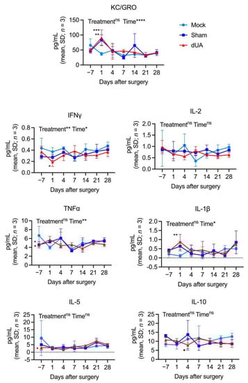 Systemic cytokine levels in mice implanted with human dUA. Cytokine levels were measured 7 days before and at 1, 4, 7, 14, 21, and 28 days after dUA implantation in mice. Each group (mock, sham or dUA) consists of three measurements of randomly pooled plasma from two to four mice from the same group (n = 3, n* = 2–4). The effect of treatment (mock, sham and dUA) and time after surgery were analysed by two-way ANOVA (post-test: Tukey test) for statistics. * p ≤ 0.05, ** p ≤ 0.01, *** p ≤ 0.001, **** p ≤ 0.0001, ns p > 0.05.