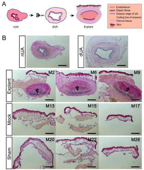 Morphological validation of successful dUA implantation and preservation in explants. (A) Schematics of localizing the dUA scaffold in the mouse explant. dUA was cut open into patches and implanted subcutaneously in mice with abluminal side facing the skin of mice. After explantation, the elastic fibres were identified by Miller’s Elastic Van Gieson stain to localise the luminal side of dUA scaffold in explant. (B) Miller’s Elastic Van Gieson stain of representative nUA, dUA, and tissue from dUA explant, mock and sham. Dark blue = elastic fibres, pink = mature collagen, yellow = red blood cells, muscle, and other tissues. M2/6/9 and similar present the numbering of mouse individuals. The luminal side of nUA and dUA shows the dark blue stained elastic fibres that were preserved. All dUA scaffolds in the explant displayed a layer of elastic fibres (marked by black arrows) distal to the skin, showing the same direction as they were implanted. No dUA scaffolds are found in tissue from mock and sham groups. Scale bars = 1 mm.