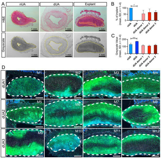 In vivo recellularization of dUA in mice. (A) Recellularization of the dUA scaffold in explants was examined by H&E stain. (Upper panel) H&E stain of nUA, dUA, and explant. The area of dUA scaffold showing host cell infiltration (marked with yellow circle) was quantified as area fraction of the total dUA scaffold. (Lower panel) greyscale images converted from H&E images. The mean greyscale value of the dUA scaffold (marked with yellow circle) in explant was quantified by ImageJ (1.52a). The lower mean greyscale value is associated with more recellularization in the area. (B) Quantification results of the recellularised area fraction of H&E images of nUA, dUA, and three explant groups according to their dUA donor. (C) Quantification results of the mean greyscale value of nUA, dUA, and three explant groups according to their dUA donor. Ordinary one-way ANOVA using Dunnett’s multiple comparisons test was applied for statistics (B,C). * p ≤ 0.05, *** p ≤ 0.001. (D) Haematopoietic marker CD45 (green) fluorescent stain of all dUA explants from 12 mouse individuals (M1–M12) from three dUA donors. Nuclei are stained by DAPI (blue). Antibody controls did not reveal any non-specific staining (Data not shown). Dotted lines mark the edge of the dUA scaffold. Scale bars = 500 µm.