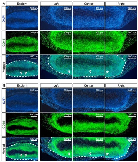 Identification of the cell type invading the dUA upon in vivo implantation. Representative images from fluorescent staining for the (A) well known haematopoietic marker (except for erythrocytes) CD45 (green) and (B) the macrophage marker CD68 (green) in dUA explants (n = 12). Nuclei are stained by DAPI (blue). Antibody controls did not reveal any non-specific staining (data not shown). The arrows mark the same location of the dUA scaffold in different magnifications. Dotted lines mark the edge of the dUA scaffold.