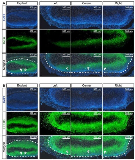 Identification of the macrophage subtype invading the dUA upon in vivo implantation. Representative images from fluorescent staining of the (A) M1 macrophage marker TNFα (green) and the (B) M2 macrophage marker CD206 (green) in dUA explants (n = 12). Nuclei are stained by DAPI (blue). Antibody controls did not reveal any non-specific staining (data not shown). The arrows mark the same location of the dUA scaffold in different magnifications. Dotted lines mark the edge of the dUA scaffold.