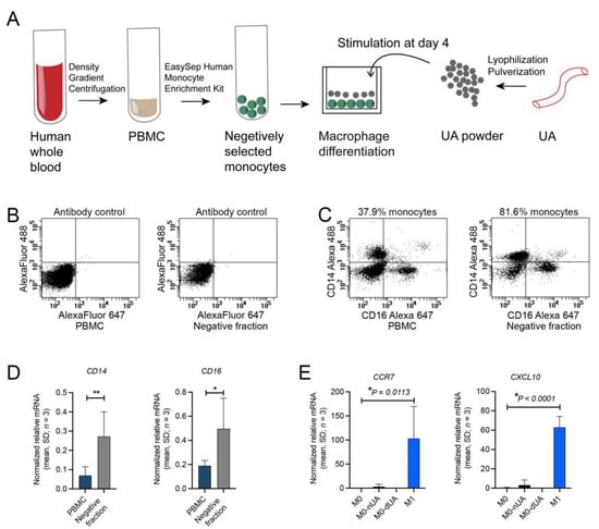 Ex vivo human pro-inflammatory profile of lyophilised human dUA powder. (A) Flow chart of human macrophage polarization upon lyophilised and powdered dUA stimulation. Peripheral blood mononuclear cells (PBMCs) were isolated from human whole blood (n = 3) after density gradient centrifugation. Human monocytes were isolated in the negative selected fraction and differentiated into M0 macrophages. At day 4, cells were stimulated with either lyophilised/powdered dUA or nUA or LPS/IFNγ for M1 stimulation (n = 3). (B,C) Representative flow cytometry of PBMCs and negative selected monocytes using (B) antibody controls or (C) CD14 and CD16 antibodies confirming monocyte enrichment. (D) Relative quantitative RT-PCR of PBMCs and negative selected monocytes for CD14 and CD16 mRNA expression further supporting monocyte enrichment. Ratio paired t-test (two-tailed) is used for statistical analysis. * p ≤ 0.05, ** p ≤ 0.01. (E) Relative quantitative RT-PCR of the pro-inflammatory M1 markers (CCR7 and CXCL10, see also Supplementary Figure S4) in M0 macrophages, nUA or dUA powder stimulated M0 macrophages (M0-nUA and M0-dUA, respectively), and positive control group (M1) stimulated by LPS and IFNγ. Ordinary one-way ANOVA (post-test: two-stage step-up method of Benjamini, Krieger, and Yekutieli) is used for statistical analysis (n = 3). All qRT-PCR data were normalised against multiple stably expressed endogenous controls according to the qbase+ platform (data not shown).