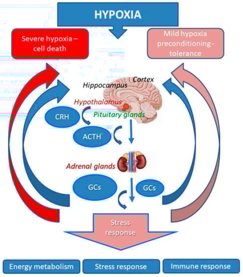 Survival of organisms requires continuous responsiveness and adaptation to various external stimuli and fluctuations of the internal environment. This is achieved through a set of physiological reactions and biochemical changes induced and coordinated by the major system of adaptation—the hypothalamic pituitary adrenal (HPA) axis [,], and particularly by glucocorticoids (GCs) as their effector hormones. GCs are released by the adrenal cortex in response to stressful environmental changes. They act both on peripheral organs and the brain, affecting their metabolism, immunity, neurotransmission, excitotoxicity, neuroplasticity, behavior, emotions and cognition []. It is impossible to find a physiological process that is not directly or indirectly affected by GCs, but nevertheless the impact of these hormones on brain adaptation to hypoxia/ischemia and development of hypoxic/ischemic tolerance is still understudied.