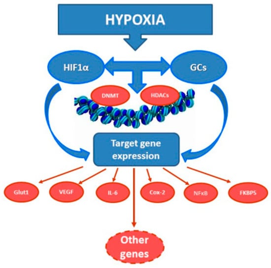 Hypoxia-induced increase of GC and HIF-1α levels facilitates their intracellular cross-talk involving related downstream mechanisms or directly leads to activation of a number of their target genes. It might also reprogram expression of other genes via modulation of the activity of DNA methyltransferases and histone deacetylases, leading to modification of chromatin structure and accessibility of gene promoters to various transcription or regulatory factors.