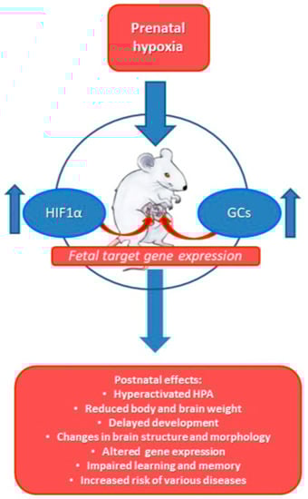 Prenatal hypoxia leading to changes both in the maternal and fetal HPA results in increased levels of GCs and HIF-1α in the developing fetus. This will lead to changes in expression of a number of fetal genes, and affects the developmental program of the new-born organism, predisposing it to various pathologies in later life. It will also modify the response of various organs of the newborn to GCs, affecting their response to various stressors in later life.
