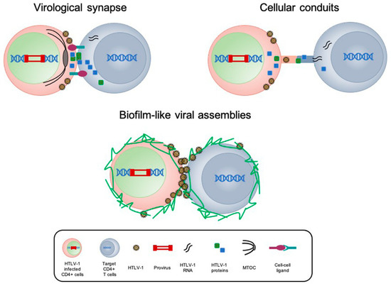 In vitro studies conducted by coculturing a target cell with HTLV-1-infected T cell line confirmed that cell-free virus is poorly infectious and a virus-induced specialized cell-to-cell contact, based on specific interactions between cellular and viral proteins, is needed for an efficient virus transmission [32]. Two types of cell–cell contacts seem to be critical for HTLV-1 transmission: long cellular connections, including cellular conduits or tunneling nanotubes (TNTs) and virological synapse [33] (Figure 2).