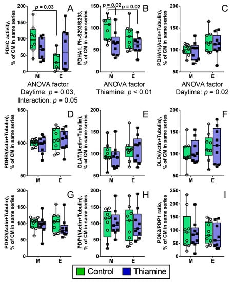 Daytime- and thiamine-dependent regulation of the PDHC activity (A); PDHA1 Ser293 phosphorylation (B); and protein levels of the catalytic and regulatory components of PDHC (C–I); The protein components are shown as UNIPROT gene names on the Y axes. The data are presented as box-plots with values determined in individual animals and their median. M—morning, E—evening. Each group is comprised of nine animals, n = 9 (B–I); with negative values of the PDHC activity being excluded (especially in Control Evening group, see Methods), n = 7–9 (A). The data are analyzed by two-way ANOVA with Tukey post-hoc test. p-values of significant differences between the four studied groups are indicated on the graphs. In case of significance (p ≤ 0.05), p-values for influence of the analyzed factors (daytime and thiamine) and their interaction are indicated under the graphs.