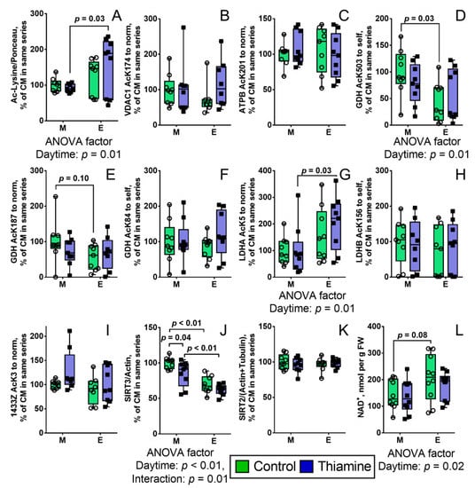 Daytime- and thiamine-dependent assays of protein acetylation in the rat brain homogenates. The graphs show the levels of total protein acetylation (A), mitochondrial proteins: VDAC1, acetylation of Lys174 (B), ATPB, acetylation of Lys201 (C), GDH, acetylation of Lys503 (D), GDH, acetylation of Lys187 (E), GDH, acetylation of Lys84 (F), cytoplasmic proteins: LDHA, acetylation of Lys5 (G), LDHB, acetylation of Lys156 (H), 1433Z (gene YWHAZ), acetylation of Lys3 (I) and levels of deacetylases sirtuin 3 (J) and sirtuin 2 (K) and their substrate NAD+ (L). The lysine residues in figure legends are referred using single letter code—K. The protein components are shown as UNIPROT gene names on the Y axes, with the exception of GDH (gene GLUD1). The data are presented as box-plots with values determined in individual animals and their median. M—morning, E—evening. Number of animals in each of the four groups: n = 9 (A–K), n = 10 (L) (see Methods). The data are analyzed by two-way ANOVA with Tukey post-hoc test. p-values of significant differences and also trends (0.1 < p < 0.05) between the four studied groups are indicated on the graphs. In case of significance (p ≤ 0.05), p-values for influence of the analyzed factors (daytime and thiamine) and their interaction are indicated under the graphs.