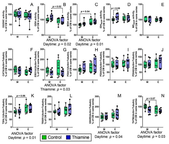 Daytime- and thiamine-dependent assays of the activities or expression of the enzymes of central metabolism linked to PDHC (A–E) and redox pathways (F–N). The enzymes and proteins are indicated on the Y axes as the first part of their UNIPROT Entry name (formerly UNIPROT ID). The data are presented as box-plots with median and all points. A single point represents the data from a single rat. M—morning, E—evening. Each group comprises of 9 animals, n = 9. The data were analyzed by two-way ANOVA with Tukey post-hoc test. p-values of the significant (p ≤ 0.05) ANOVA factors (daytime and thiamine) and their interaction are indicated on the graphs. p-values of significant differences between groups and also trends (0.1 < p < 0.05) are shown above the corresponding arches.