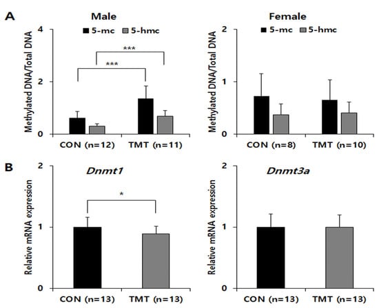 Global DNA methylation and Dnmt gene expression in the hippocampi of mice prenatal exposed to TMT. (A) Sex differences in global cytosine methylation and hydroxymethylation in genomic DNA samples of control and TMT groups. (B) Relative mRNA expression of Dnmt1 and Dnmt3a, normalized to Gapdh as an internal control in the male hippocampus. * p < 0.05, *** p < 0.001 compared to control (CON). Data are shown as means ± standard deviations (SD).