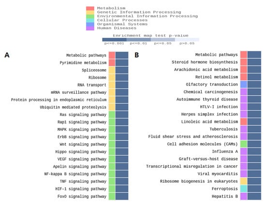 Top-ranked gene enrichment networks from querying the KEGG database with MBD-seq data from prenatal TMT exposed male hippocampus. (A) CGI promoter region. (B) Non-CGI promoter region.