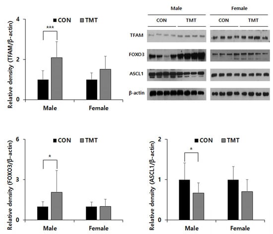 To confirm the reliability of the GO analysis of the DMR data, we selected the mitochondria-related Tfam gene for the metabolism pathway, Foxo3 gene for the FOXO signaling pathway and the Ascl1 gene was additionally selected and evaluated their mRNA expression by qPCR. Although there was no change in mRNA expression of Tfam and Ascl1, an increase in the mRNA expression level of Foxo3 gene in TMT male hippocampus (p = 0.039) can be observed. In the Western blot analysis (Figure 3), though there was no difference between CON and TMT groups in the female hippocampus, TFAM expression was increased in the TMT-exposed male hippocampus (p < 0.001). An increasing FOXO3 expression in male hippocampus exposed to prenatal TMT (p = 0.041) was also observed. In addition, we observed a decreased expression of ASCL1, which has been reported to be a crucial regulator of multiple aspects of neurogenesis and shares common targets with FOXO3 in the male hippocampus (p = 0.024).
