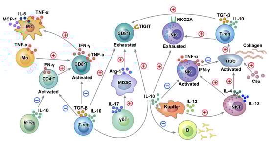 Multiple factors from immune cells play a role in the cross-talk and immune balance in HBV-related HCC (Figure 3). During chronic HBV infection, CD4+T and CD8+T cells, NK cells, NKT cells, monocytes/macrophages, and HSCs induce inflammation, leading to the development of HCC. Furthermore, pro-inflammatory cytokines aggravate the inflammation in chronic hepatitis [16,19,20]. Conversely, immunosuppressive cells, including Treg, Breg, MDSC, and Kupffer cells, produce TGF-β and IL-10 and may act as negative regulators of immune function [5,25,88,91,92].