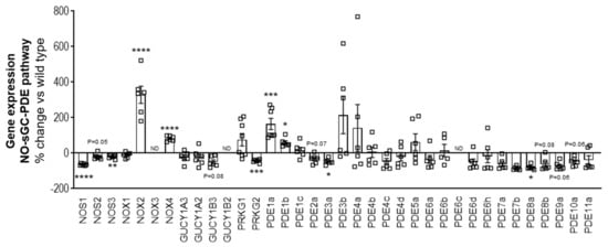 The NO-sGC-PDE pathway is largely downregulated in the skeletal muscle of mdx/mTRG2 mice. Fold change of mRNA expression of various genes in the NO-sGC-PDE signaling pathway in 22-week old mdx/mTRG2 versus wild type C57BL6/J mice in the quadriceps. All values are expressed as mean ± SEM. * p < 0.05; ** p < 0.01; *** p < 0.001; **** p < 0.0001; ns, not significant for unpaired t-test.