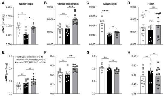 BAY-747 administration increased cGMP levels in skeletal muscles of mdx/mTRG2 mice. cGMP (A–D) and cAMP (E–H) levels were measured in various skeletal muscles including (A,E) quadriceps, (B,F) rectus abdominis, (C,G) diaphragm as well as (D,H) the heart, respectively. * p < 0.05; ** p < 0.01; *** p < 0.001; **** p < 0.0001; ns, not significant for one-way ANOVA followed by Dunnett’s multiple comparisons post-hoc test.