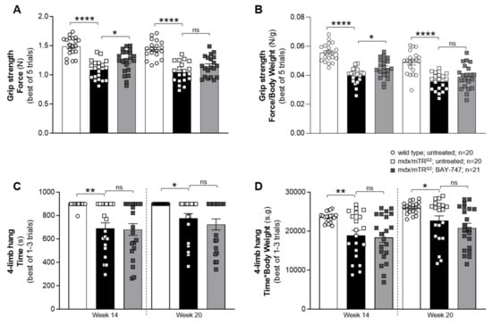 BAY-747 treatment improved forelimb grip strength but not the four-limb hang capacity in mdx/mTRG2 mice. Treatment with BAY-747 improves forelimb grip strength capacity (A,B) but does not improve four-limb hang capacity (C,D) of mdx/mTRG2 mice compared to untreated mdx/mTRG2 mice at the interim time point (Week 14) but not to a significant level at the final time point assessed (Week 20). * p < 0.05; ** p < 0.01; **** p < 0.0001; ns, not significant for one-way ANOVA followed by Dunnett’s multiple comparison post-hoc test.