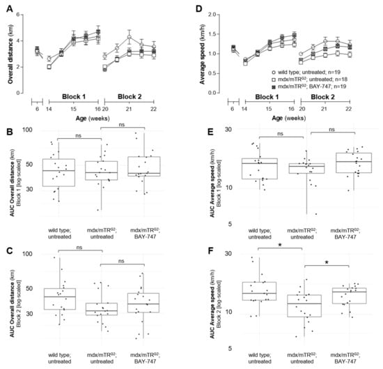 Treatment with BAY-747 improved speed but not the overall distance run by mdx/mTRG2 mice in the running wheel functional assessment. In the voluntary running wheel assessment, mice treated with BAY-747 run the same overall distance (A) but at a faster average speed (D) than untreated mdx/mTRG2 mice. AUC was calculated for each mouse and log-transformed for Blocks 1 and 2 for overall distance (B,C) and average speed (E,F), respectively. * p < 0.05; ns, not significant. For statistical analysis method, please refer to the Materials and Methods section.