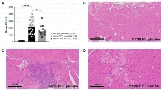 Serum creatine kinase (CK) is a key biomarker of skeletal muscle damage, and in patients with BMD and DMD it has been found that the levels of CK are up by 25- to 200-fold [] compared to healthy individuals. At 22 weeks of age, we observed that mdx/mTRG2 mice have a nearly 25-fold increase (2178 ± 214.2 U/L) in serum CK levels compared to wild-type mice (91.26 ± 6.25 U/L, p < 0.05). Following 16 weeks of treatment with BAY-747, the levels were significantly reduced to 1551 ± 176.1 U/L (p < 0.05 versus untreated mdx/mTRG2) (Figure 5A). Furthermore, although we observed that BAY-747 treatment was able to reduce serum CK levels, assessment of skeletal muscle pathology for degeneration and necrosis showed no significant improvement in the mdx/mTRG2 mice (Figure 5C,D). Wild type mice showed no signs of degeneration or necrosis and were given a score of 0 (i.e., no finding present; Figure 5B). Skeletal muscle injury was characterized by focal or multifocal acute necrosis of muscle fibers or older degenerative/atrophic lesions with signs of regeneration. In acute necrotic lesions, injured fibers were pale eosinophilic with loss of striation. The fibers appeared swollen with nuclear debris at the periphery along the sarcolemma (Figure 5D). In older lesions (Figure 5C) degeneration/regeneration is reflected by a more basophilic appearance of affected fibers, centrally located nuclei and a decreased fiber diameter (atrophy). Besides the age of the lesions, the area of damage is similar in untreated and BAY-747-treated mdx/mTRG2 mice (Grade 3—moderate). Focal lesions of different age can be found in one animal side by side.