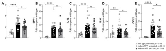 Markers of inflammation, including that of pro-inflammatory cytokines such as tumor necrosis factor (TNF), osteopontin (SPP1), interleukin (IL)-1β and IL-6 and the chemokine CCL2 were all significantly upregulated in the quadriceps of mdx/mTRG2 mice at the mRNA level (Figure 6A–E), and this translated to an increase in infiltration of immune cells including that of leukocytes, neutrophils and macrophages into various skeletal muscles (Figure 6F–H). A total 16 weeks of treatment with BAY-747 was able to reduce the expression of some of these markers including TNF, IL-6 and CCL2 (Figure 6A,D,E), however the decrease in expression of SPP1 and IL-1β was not statistically significant (Figure 6B,C). Although we saw a decrease in some of the markers of inflammation at the gene expression level, this appeared to have no impact on immune cell infiltration into various skeletal muscles at least at 16-weeks post-treatment with BAY-747 (Figure 6F–H).