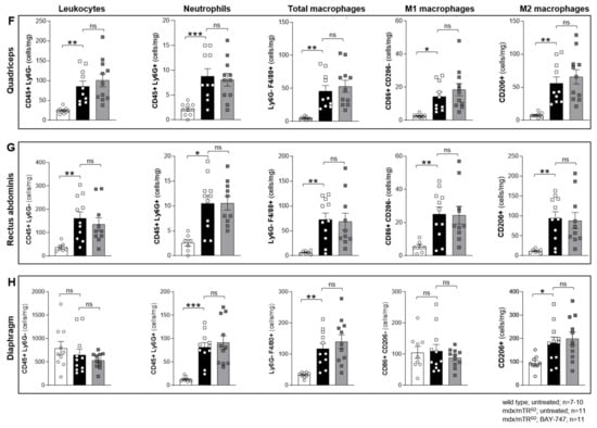 Treatment with BAY-747 on mdx/mTRG2 mice reduces expression of markers of inflammation at the gene level but not immune cell infiltration into the skeletal muscle. The effect of treatment with BAY-747 on levels of mRNA expression on pro-inflammatory genes (A) TNF, (B) SPP1, (C) IL-1β, (D) IL-6 and (E) CCL2 in the quadriceps and immune cell infiltration of (F) quadriceps, (G) rectus abdominis and (H) diaphragm of mdx/mTRG2 mice. * p < 0.05; ** p < 0.01; *** p < 0.001; **** p < 0.0001; ns, not significant for one-way ANOVA followed by Dunnett’s multiple comparison post-hoc test.