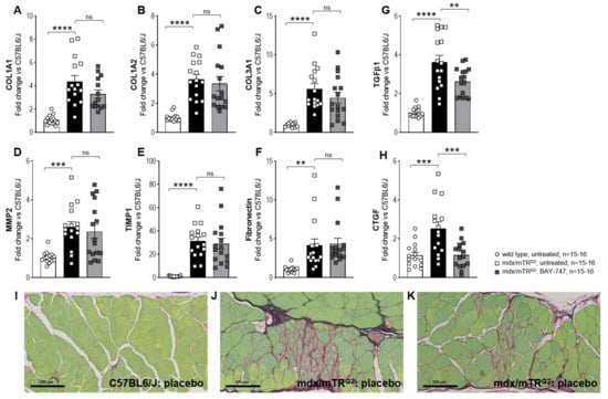 Treatment with BAY-747 reduces expression of markers of fibrosis at the gene level but not collagen accumulation in the skeletal muscle of mdx/mTRG2 mice. The effect of treatment with BAY-747 on levels of mRNA expression on pro-fibrotic genes (A) COL1A1, (B) COL1A2, (C) COL3A1, (D) MM2, (E) TIMP1, (F) fibronectin, (G) TGFβ1, (H) CTGF in the quadriceps. Representative images of Sirius Red/Fast Green-stained rectus abdominis tissue sections of (I) wild type: untreated; (J) mdx/mTRG2: untreated; and (K) mdx/mTRG2: BAY-747. ** p < 0.01; *** p < 0.001; **** p < 0.0001; ns, not significant for one-way ANOVA followed by Dunnett’s multiple comparison post-hoc test.