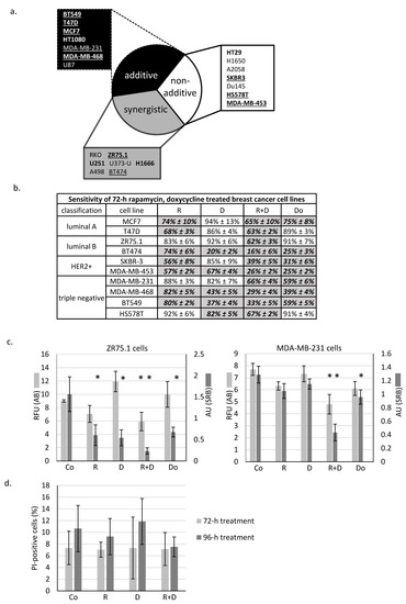 In vitro rapamycin and doxycycline combinations have significant anti-tumour growth effects in the majority of the studied cancer cell lines. (a) In vitro additive and synergistic anti-proliferative effects of rapamycin and doxycycline in 2/3rd of studied cells. Based on proliferation data, the effects of combined treatments could be divided into three categories: (a) additive; (b) non-additive and (c) synergistic. Underlined: human breast cancer cell lines, bold: proliferation inhibition >50%. The additive and synergistic effects of rapamycin and doxycycline combination were calculated using combination index. (b) The effects of 72-h-treatments of the 10 studied breast cancer cell lines (detected with Alamar blue assay). Cell proliferation was given in control % (mean ± SD). All data represent mean ± SD. Bold fonts with italics and grey background: p ≤ 0.05 (c) Alamar blue (AB) and sulforhodamine B (SRB) assays monitored the in vitro cell growth in ZR75.1 and MDA-MB-231 cell cultures after 72-h treatment. Data show either relative fluorescence unit (RFU; AB assay) or absorbance unit (AU; SRB test). All data represent mean ± SD. * p ≤ 0.05 (d) Necrosis was not detectable after rapamycin and doxycycline treatment. Flow cytometry analysis of propidium iodide (PI) stained cells in 72-h and 96-h-treated ZR75.1 cells in vitro. Results were given in control %. (Co—control; R—rapamycin, 50 ng/mL; D—doxycycline, 10 µM; R+D—rapamycin + doxycycline combination; Do—doxorubicin, 50 ng/mL).