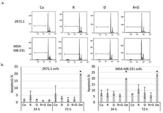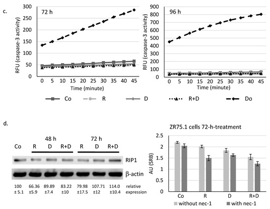 Rapamycin and doxycycline in vitro treatments do not induce apoptosis or necroptosis in 72-h-treated ZR75.1 and MDA-MB-231 cells. (a) Flow cytometry analyses of apoptotic cells (fixed, alkaline extracted and PI stained). Linear bar shows the apoptotic subG1 cell fraction. (b) The detected % of apoptotic cells in 24-and 72-h-treated ZR75.1 cells and MDA-MB-231 in vitro. * p ≤ 0.05 (c) Caspase-3 activity was not increased in vitro in 72-h or 96-h rapamycin + doxycycline-treated ZR75.1 cells. Caspase-3 activity was measured by Z-DEVD-AMC, data show relative fluorescence unit (RFU), doxorubicin treatment was the positive control in these measurements. (d) The sign of necroptosis, the increase of RIP1 expression was not detected in 72-h-treated ZR75.1 cells. Western blot analysis of RIP1 after 48-h and 72-h rapamycin and doxycycline treatments (left panel). Nor necrostatin-1 (nec-1) nor Ac-DEVD-CHO (caspase-3 inhibitor) could inhibit the anti-proliferative effects rapamycin + doxycycline in 72-h-treated ZR75.1 cells in vitro—data of Alamar blue assay represent relative fluorescence unit (RFU) (right panel). (Co—control; R—rapamycin, 50 ng/mL; D—doxycycline, 10 µM; R+D—rapamycin + doxycycline combination; Do—doxorubicin, 50 ng/mL, nec-1—50 µM; Ac-DEVD-CHO—1 µM).