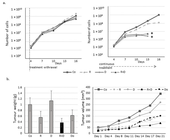 Long-term effect of rapamycin/Rapamune + doxycycline in ZR75.1 cells. (a) The growth curves of rapamycin and doxycycline treatments in ZR75.1 cells in vitro. The experiment was performed for 16 days. After a 72-h pre-treatment with rapamycin and doxycycline, treatments were either withdrawn (left panel) or continued as a long-term treatment (right panel) for an additional 12 days. Each nod labels a subculture. Results represent cumulative cell numbers. (Co—control; R—rapamycin, 50 ng/mL; D—doxycycline, 10 µM; R+D—rapamycin + doxycycline combination) * labels the stopped cell growth (no more viable cells). (b) The measured tumour weights (left panel) and the growth curve (right panel) of the ZR75.1 xenografts after 21-day treatments. Rapamune + doxycycline significantly reduced the tumour growth (black column). (Co—control; R—rapamycin/Rapamune 3 mg/kg; D—doxycycline 5 mg/kg; R+D—rapamycin/Rapamune + doxycycline combination; Do—doxorubicin, 2 mg/kg).