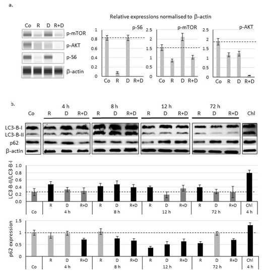 Decreased mTOR activity and activation of autophagy after in vitro rapamycin and doxycycline treatment in ZR75.1 cell line. (a) Decreased expressions of mTOR activity-related proteins were assessed by WesTM Simple technique (left panel). β-actin was used as loading control. Densitometric analysis of the studied proteins was presented in the right panel. (b) Time-dependent protein level changes of LC3-B-I/II and p62 detected with Western blot confirmed the autophagy induction. Protein level was normalised to β-actin. Chloroquine (Chl) was the positive control in this experiment. The results LC3-B-II/I ratio and relative expression of p62 based on densitometric analysis of the studied proteins were presented in the middle and lower panels. Dashed lines show the obtained level of control values. Data represent mean ± SD. (Co—control; R—rapamycin, 50 ng/mL; D—doxycycline, 10 µM; R+D—rapamycin + doxycycline combination; Chl—chloroquine, 50 µM).