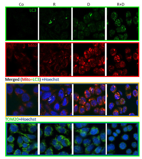 Fluorescence stainings of mitochondria and autophagy markers, and cellular adaptation to 72-h rapamycin and doxycycline treatments in ZR75.1 cell line in vitro. Fluorescence images show the staining intensity and cellular distribution of MitoTracker (red), LC3 (green) and their co-localisation (as merged) or TOM20 (green) in treated ZR75.1 cells after immunostainings using confocal microscopy. Hoechst dye was used to counterstain nuclei (blue); (magnification 63×). (Co—control; R—rapamycin, 50 ng/mL; D—doxycycline, 10 µM; R+D—rapamycin + doxycycline combination).